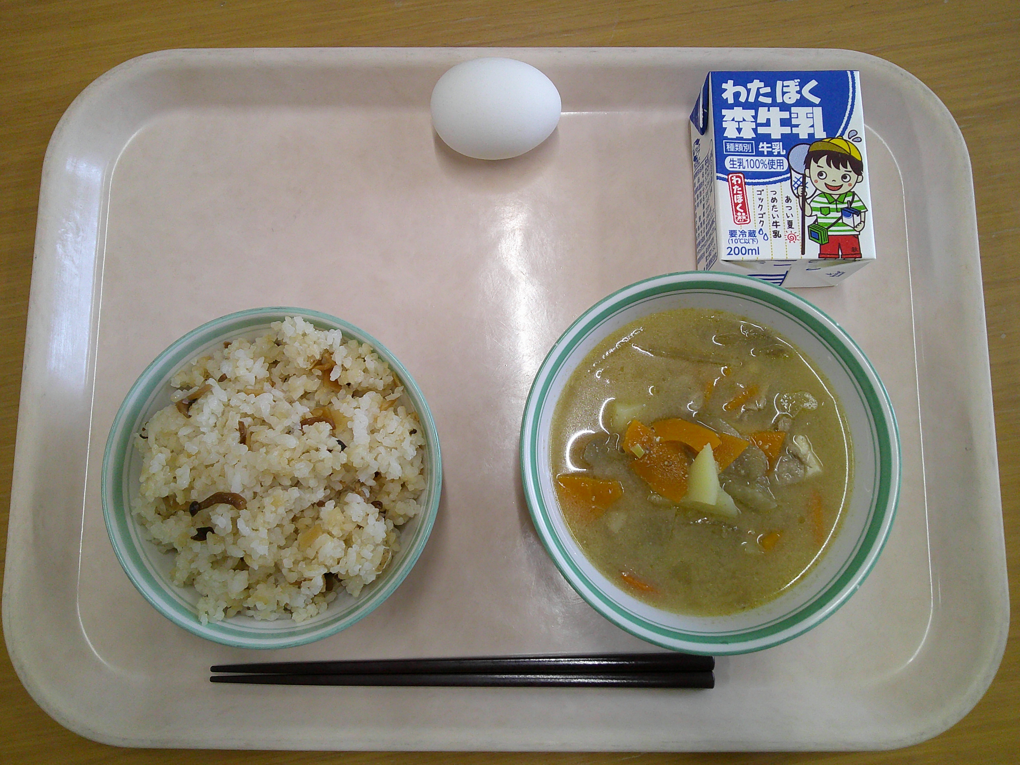 牛乳、防災備蓄米混ぜご飯、ゆで卵、豚汁