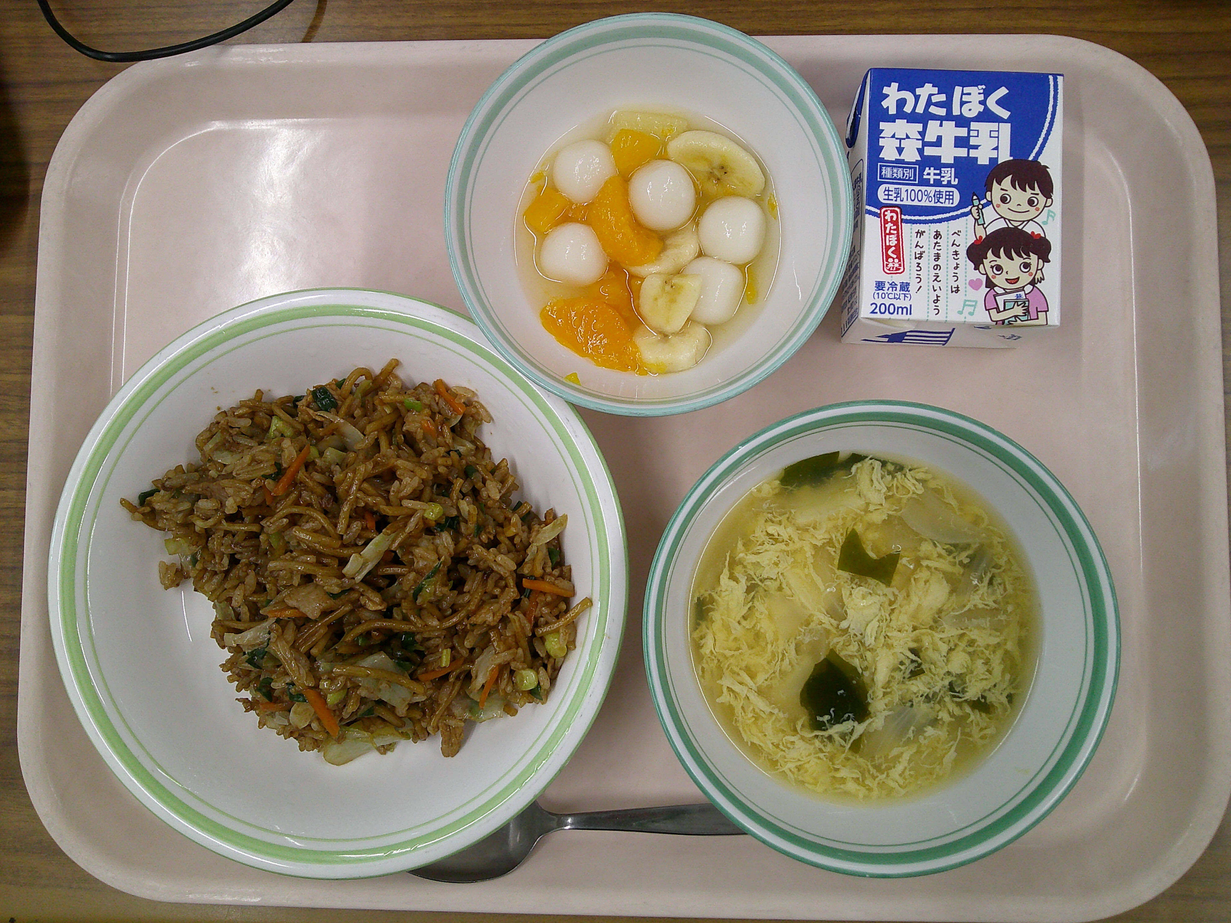 牛乳、そばめし、かきたまスープ、白玉フルーツポンチ