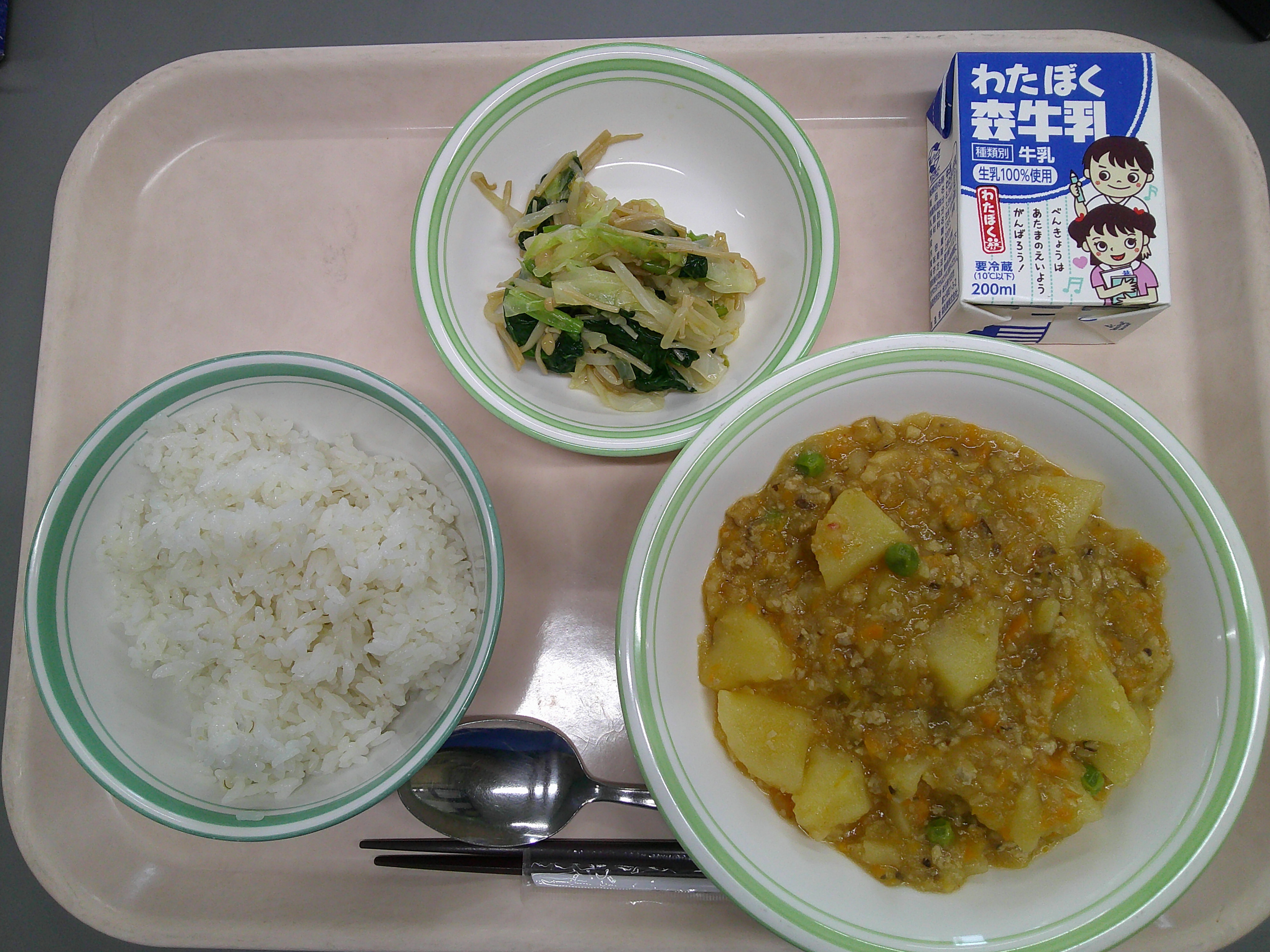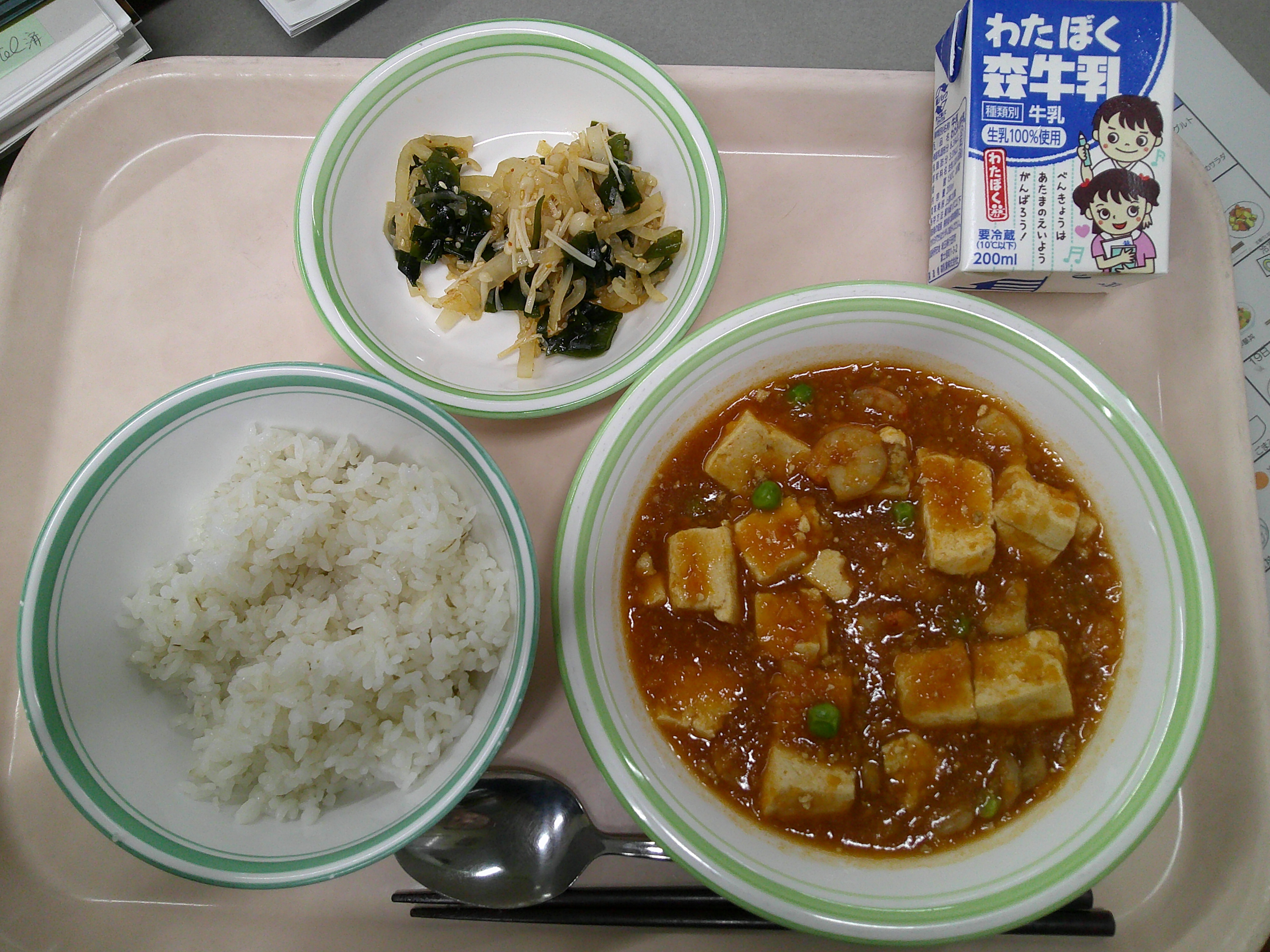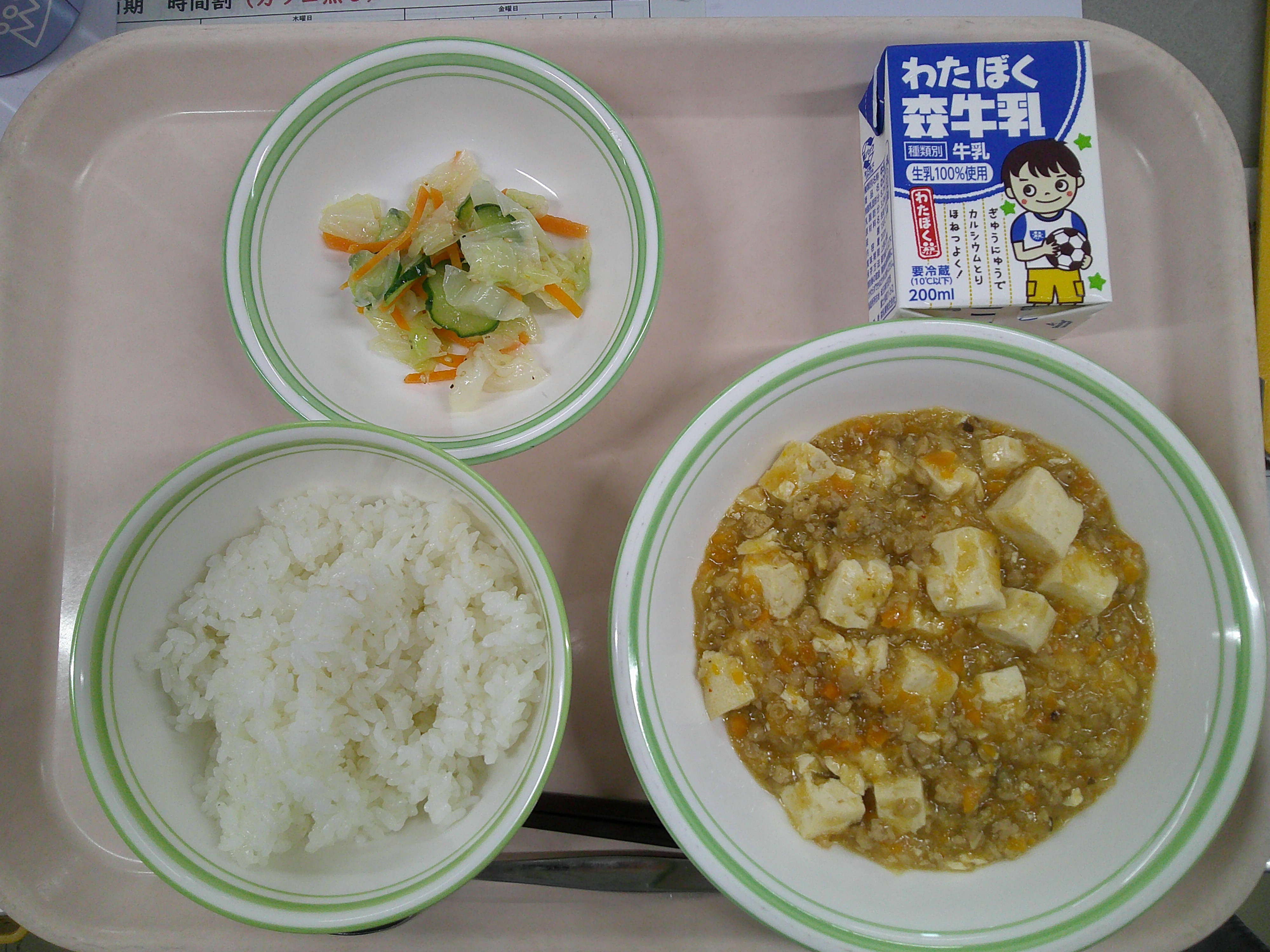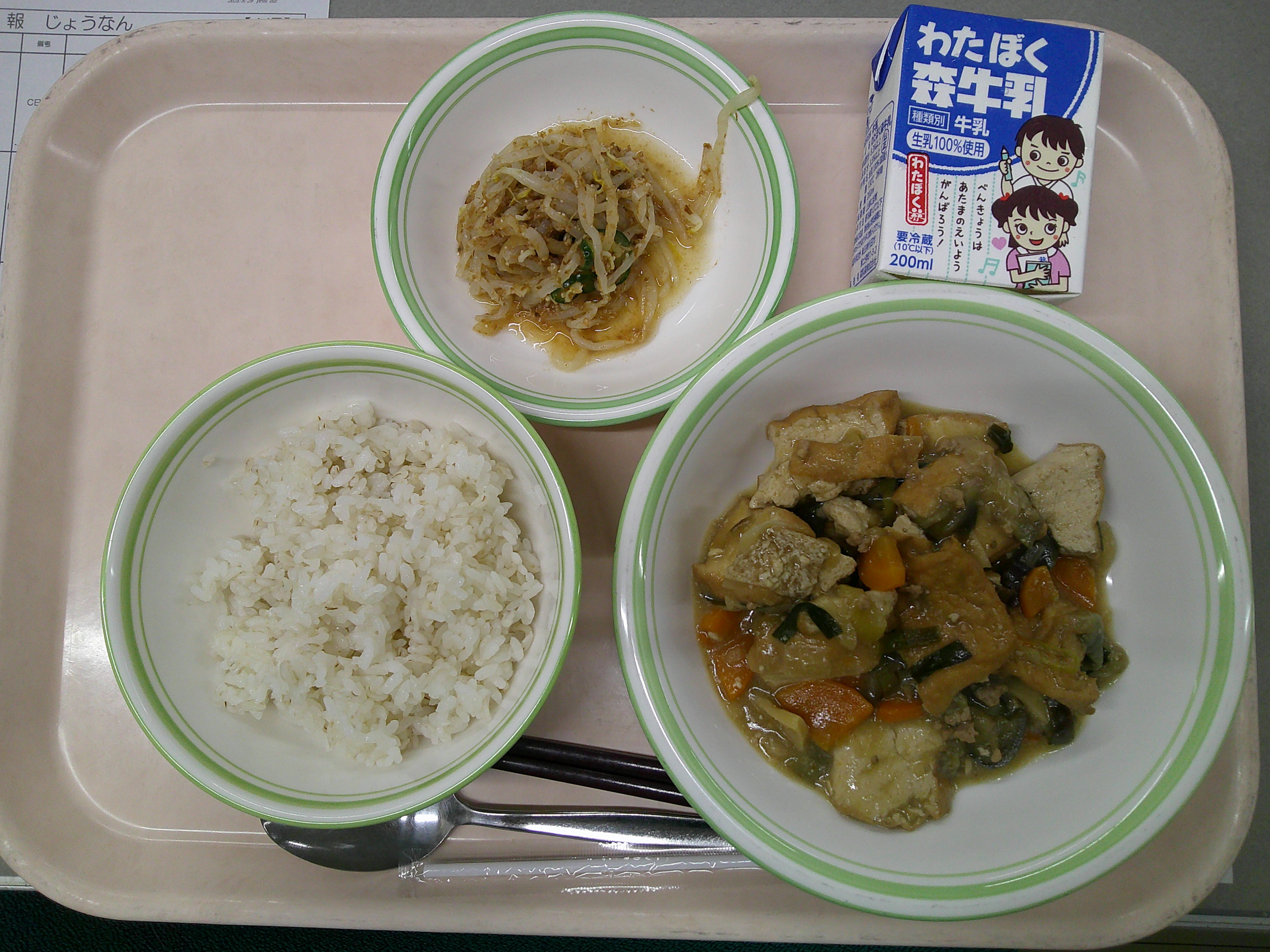 牛乳、麦ご飯、じゃが麻婆、なめ茸和え