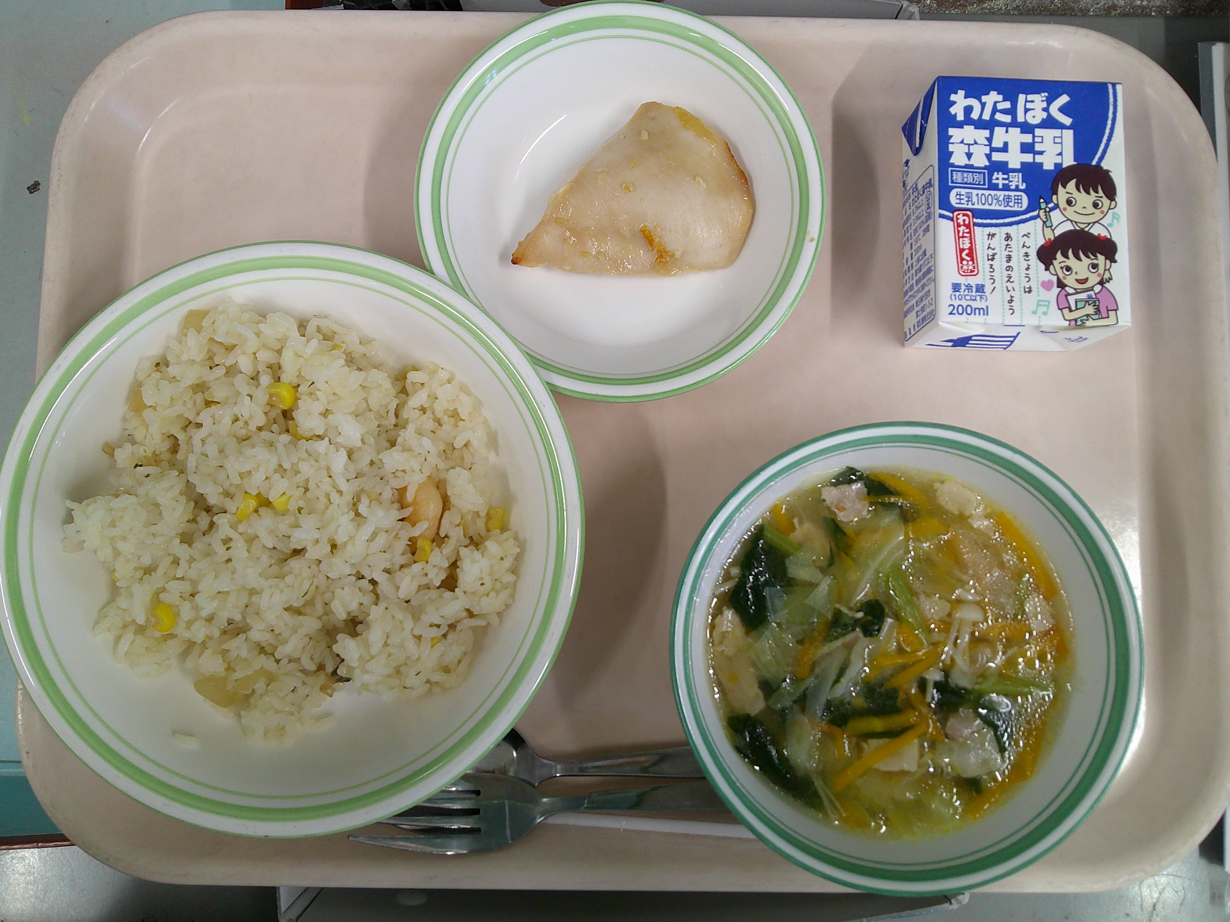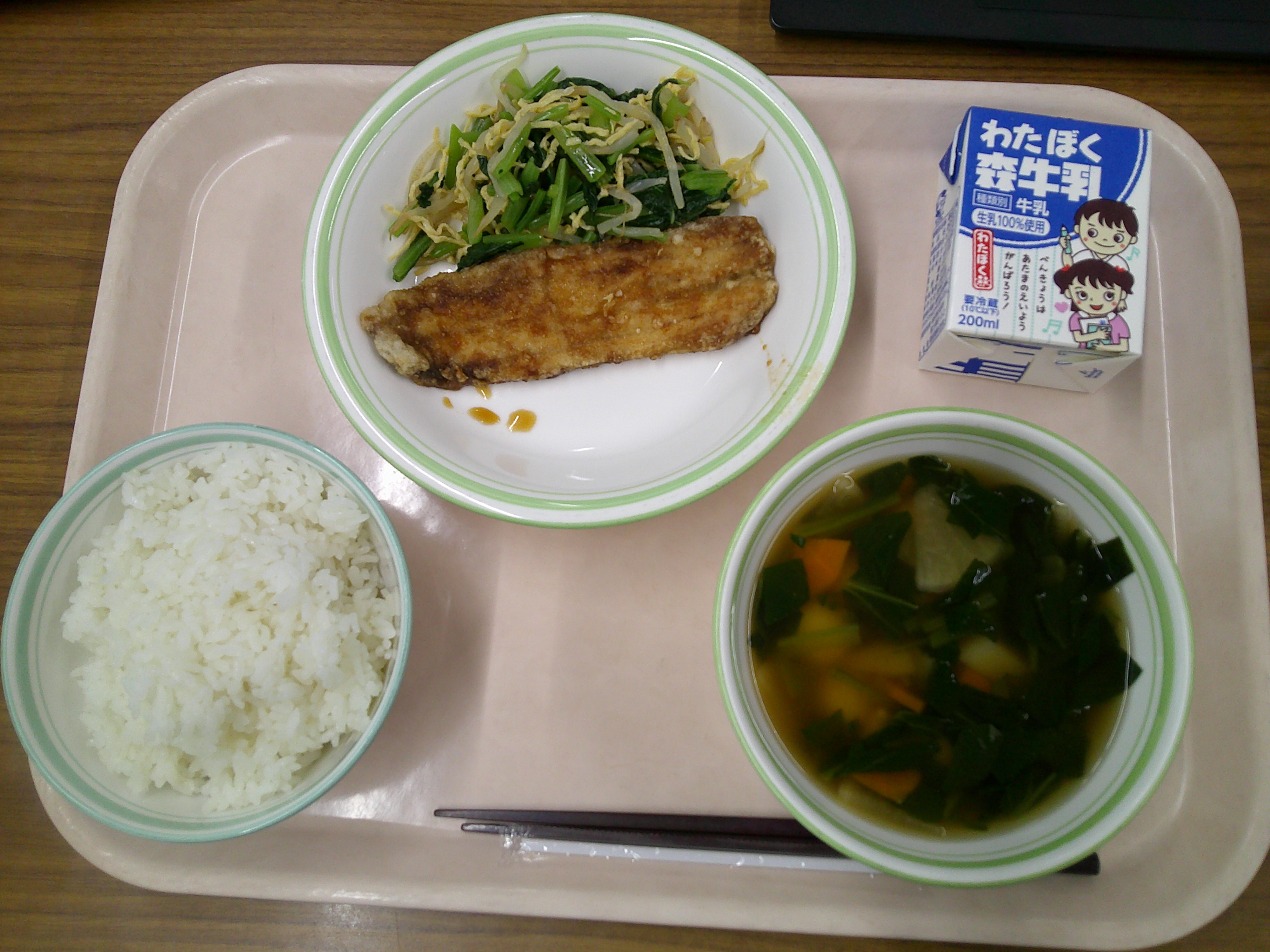 牛乳、チャーハン、ニギスフライ、青菜ときのこのスープ