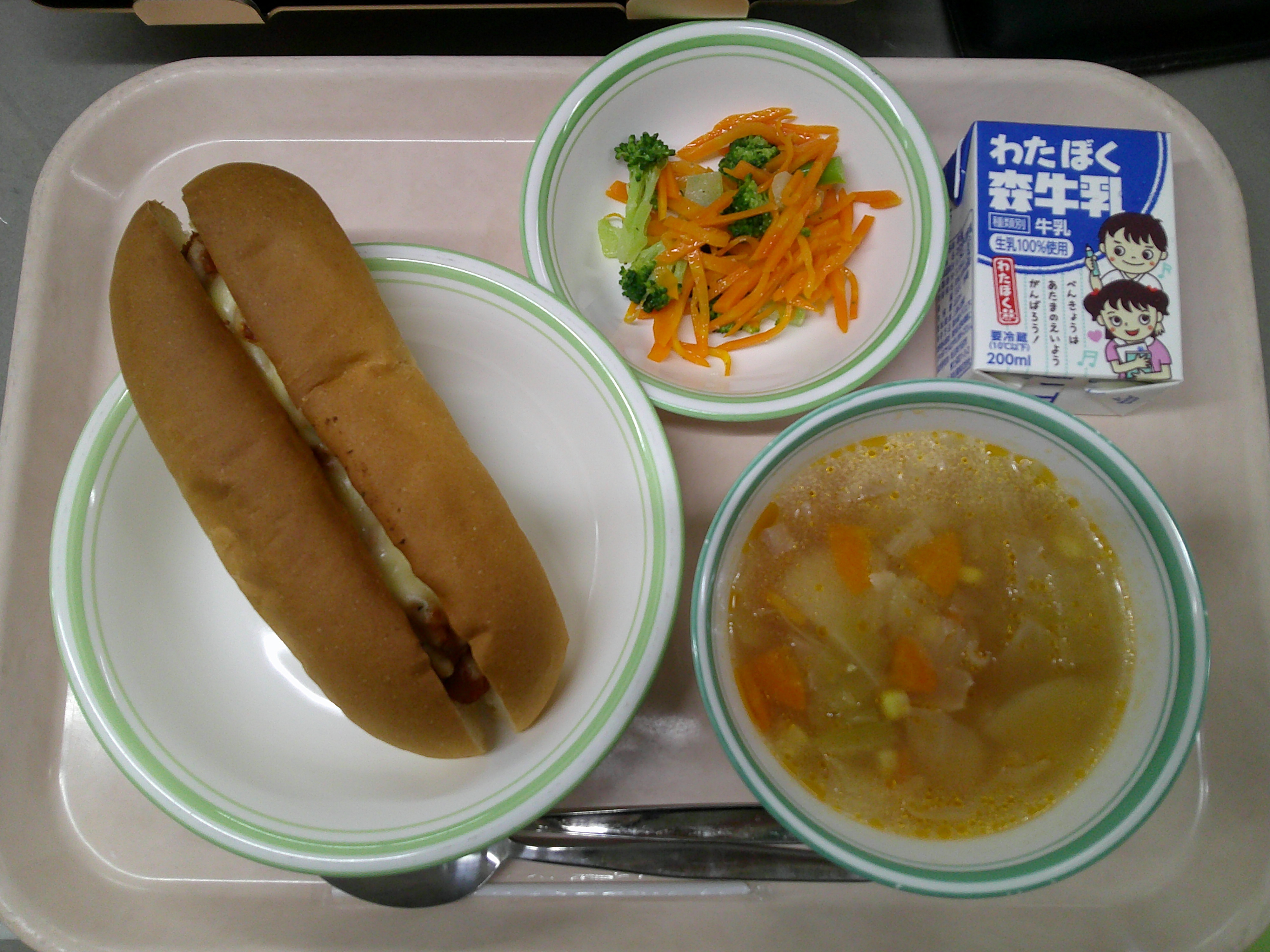 牛乳、スパイシードック、じゃがべースープ、にんじんとブロッコリーサラダ