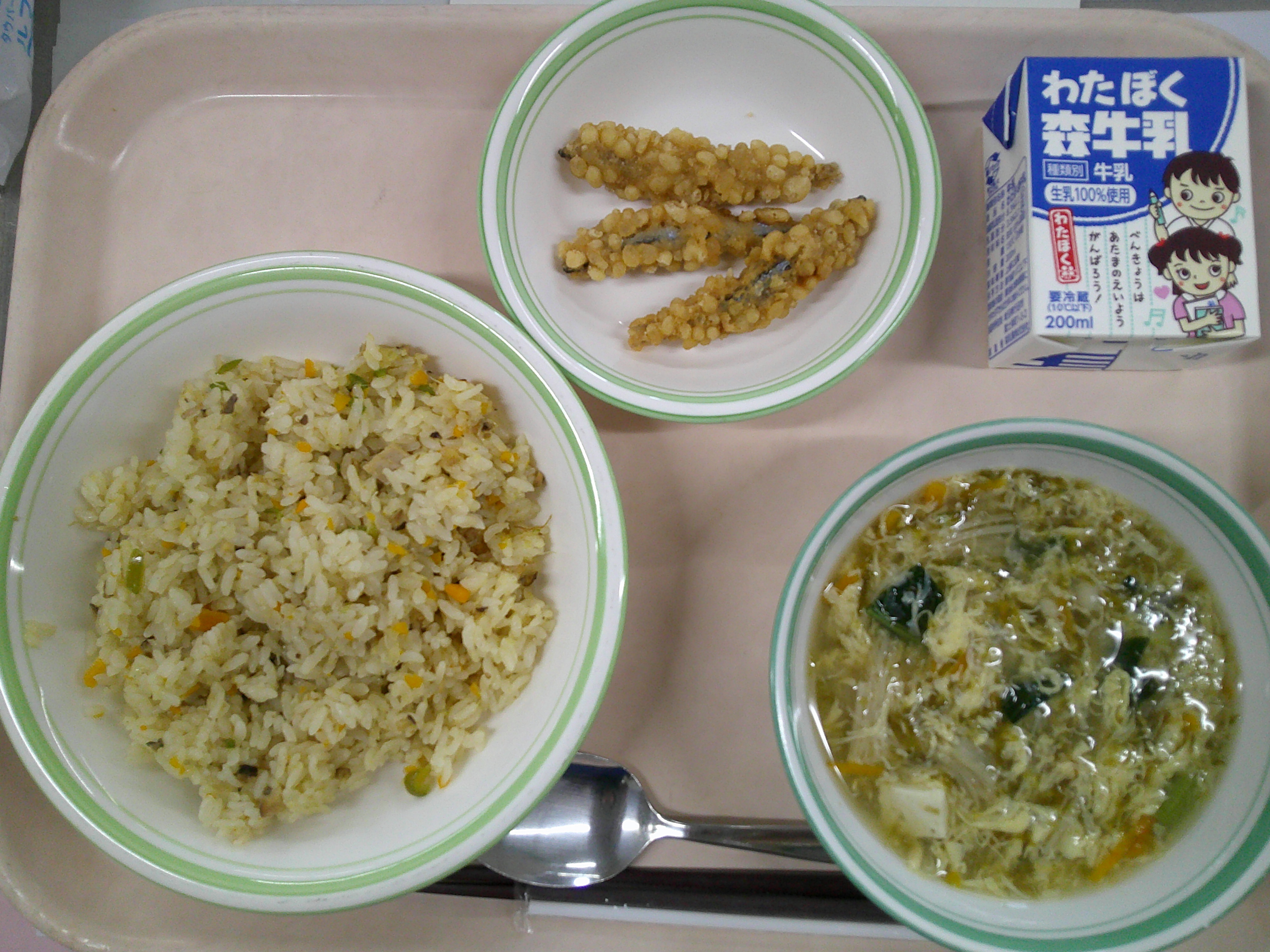 牛乳、チャーハン、きびなごのサクサク揚げ、のりと卵のスープ