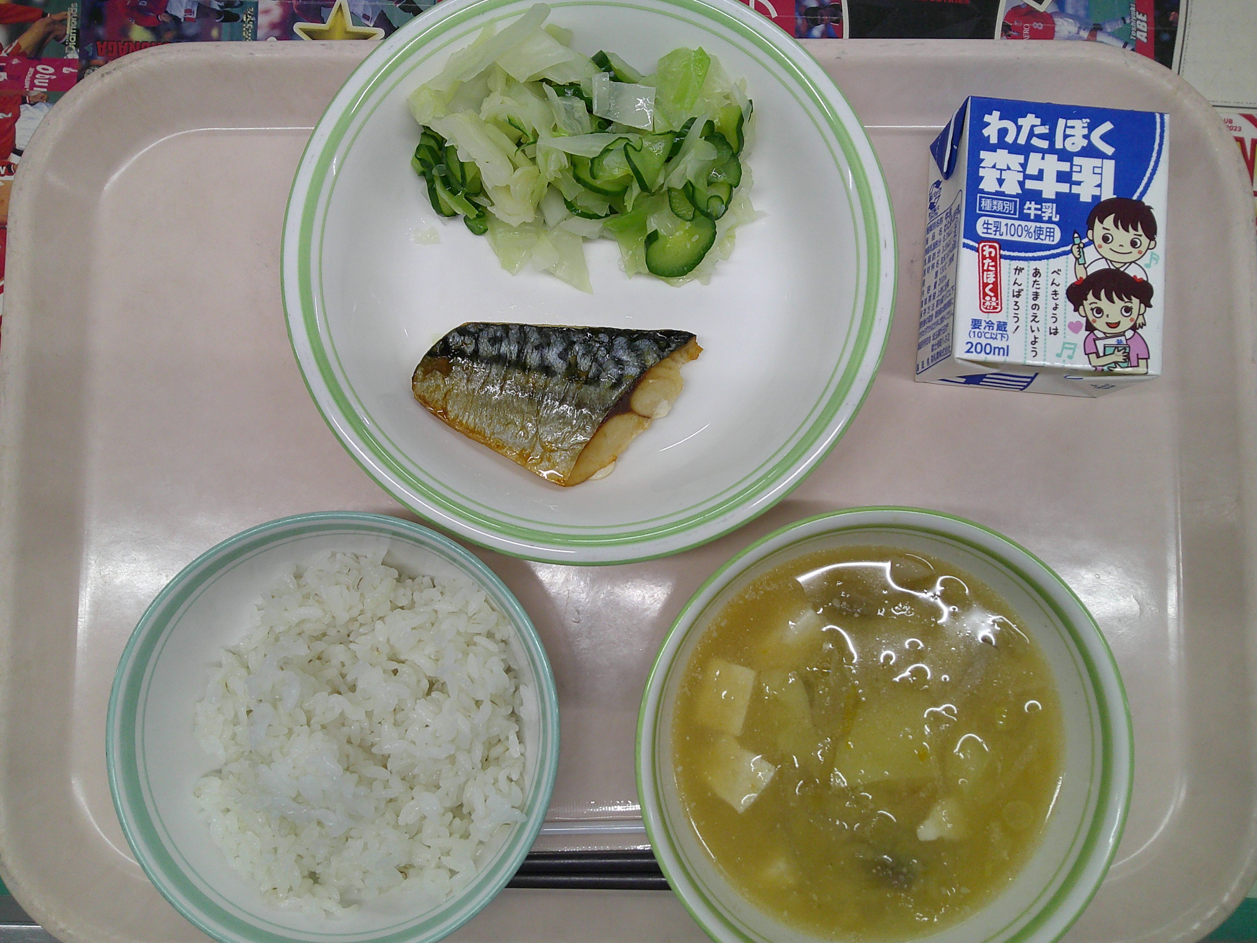 牛乳、麦ご飯、さばの塩焼き、即席漬け、ごまみそ汁