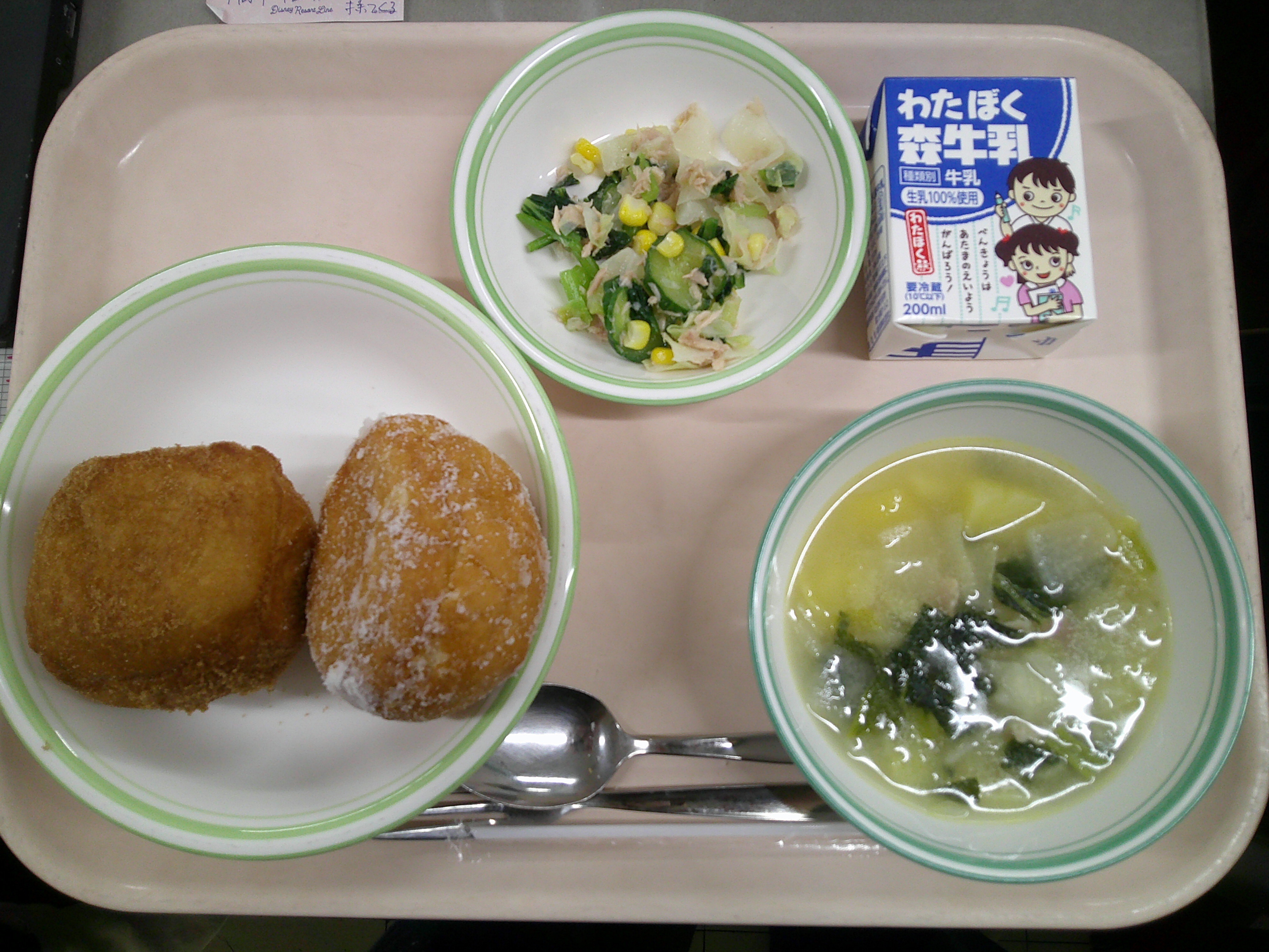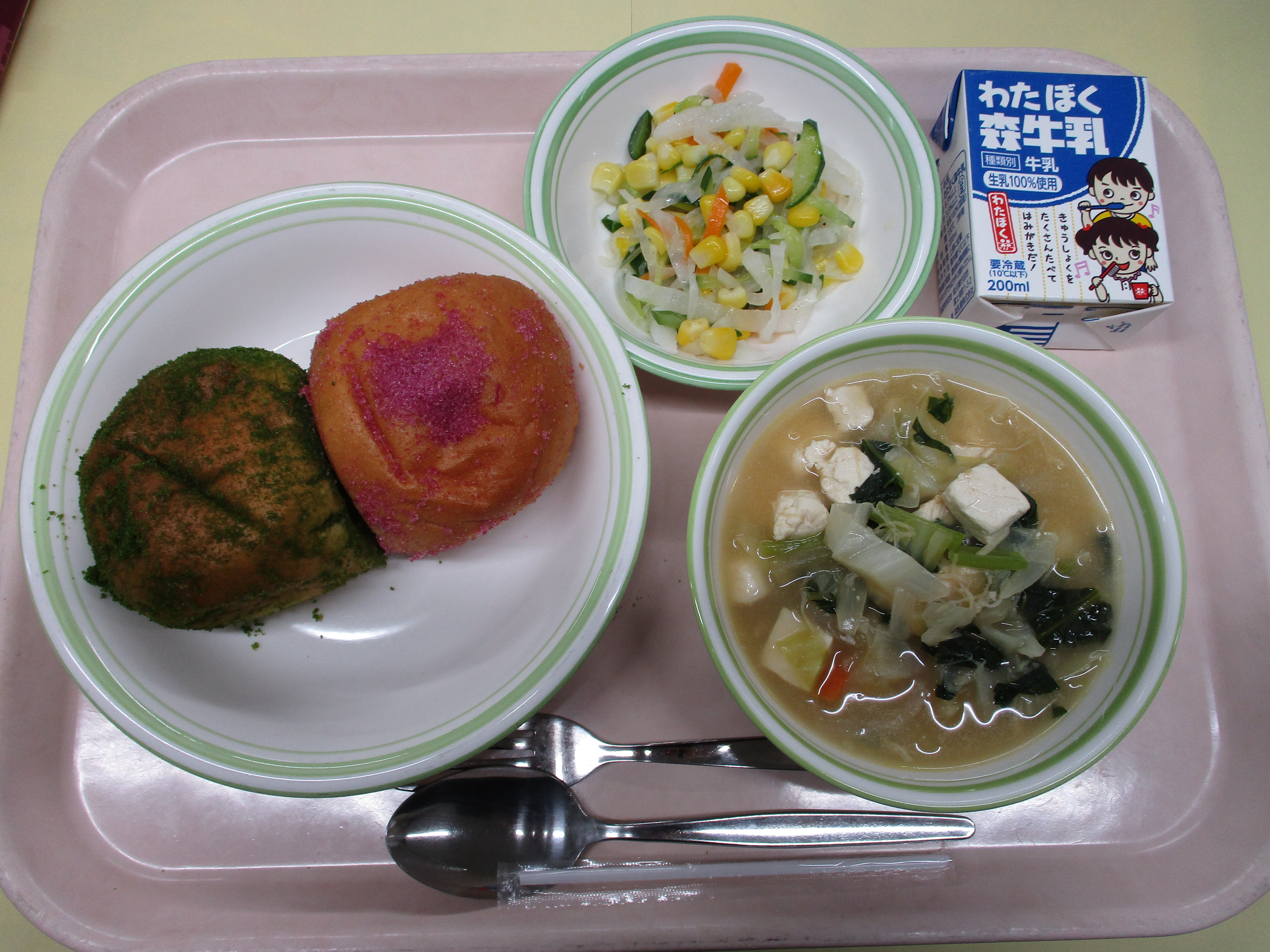 牛乳、2色揚げパン(ブルーベリー・抹茶)、豆腐の中華煮、大コーンサラダ