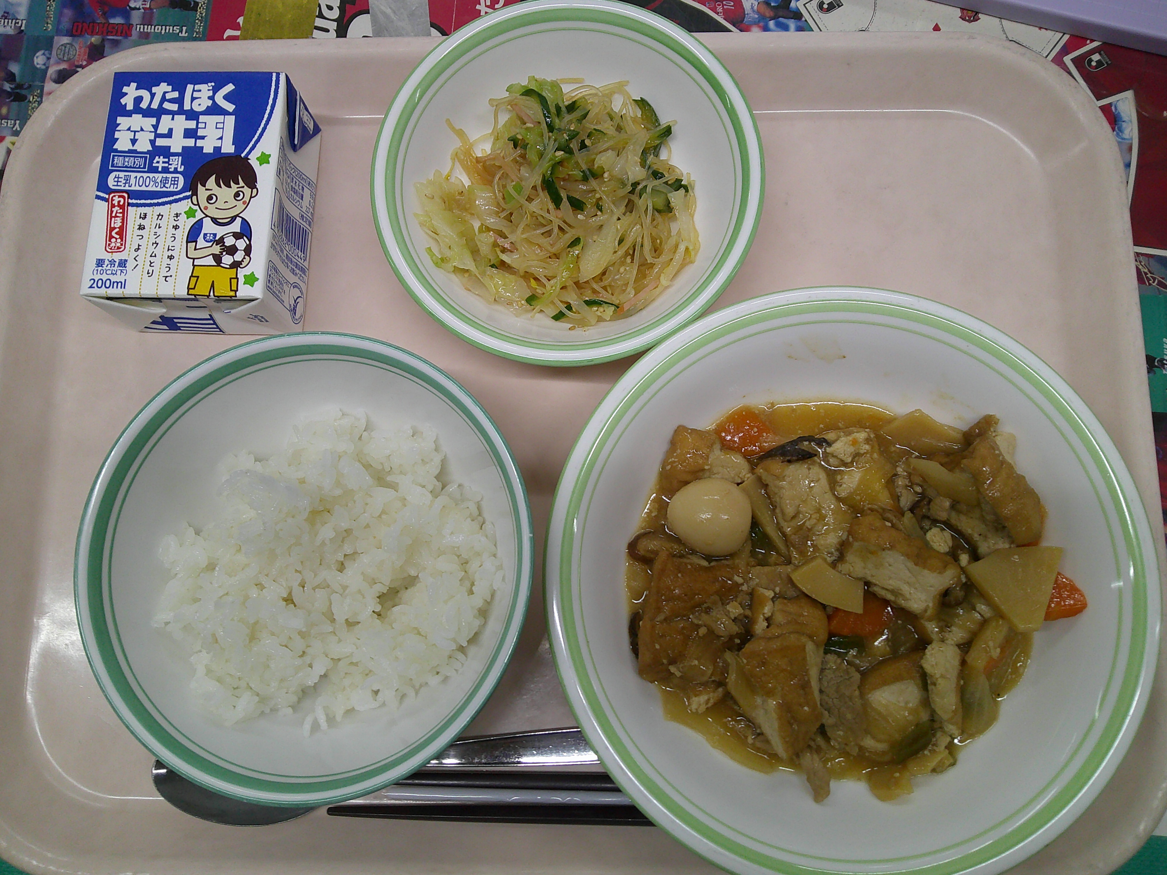牛乳、岩槻ご飯、生揚げの中華煮、春雨サラダ
