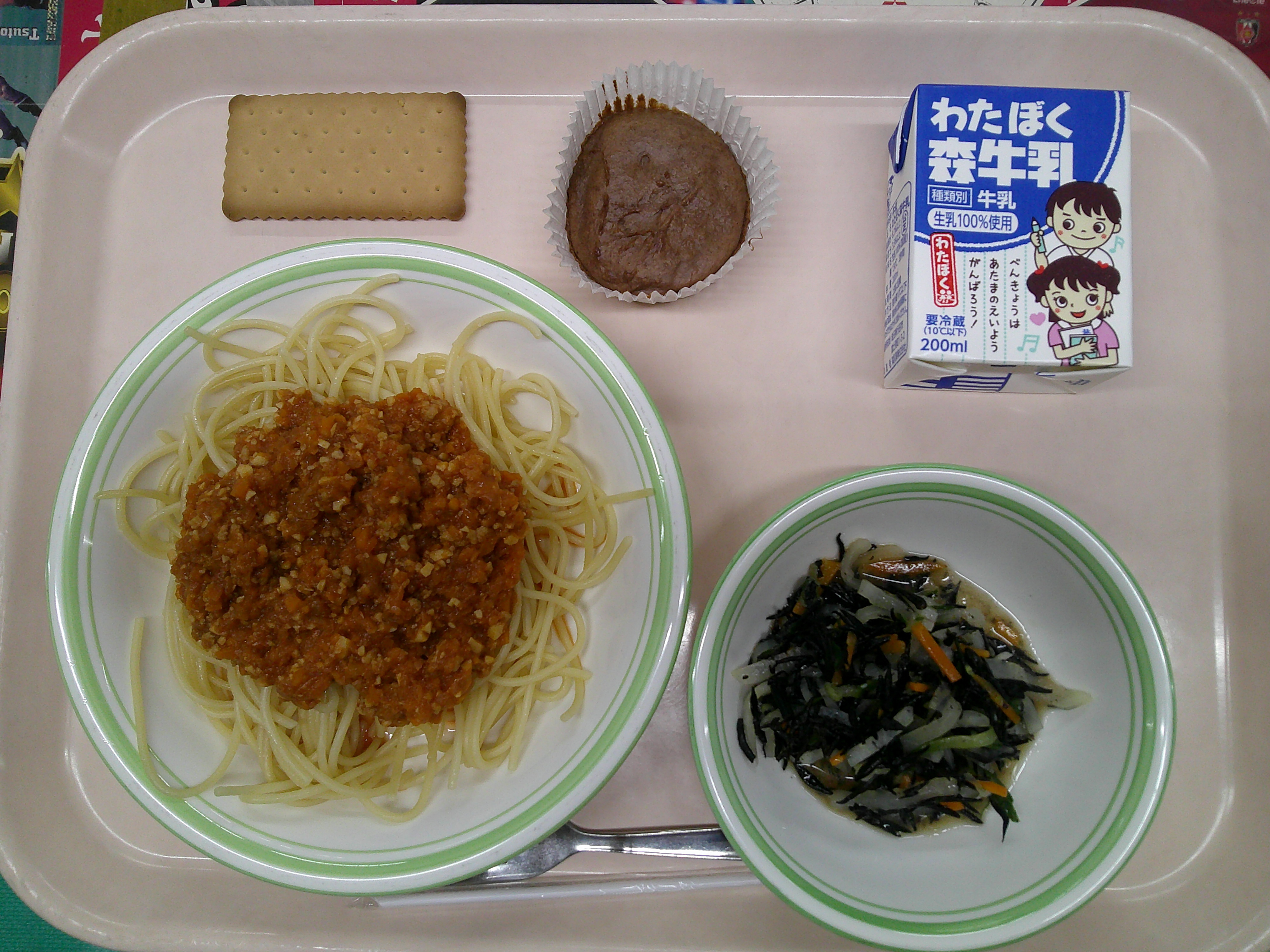 牛乳、ミートビンズスパゲッティ、ひじきのマリネ、防災ビスケットを使ったチョコレートチーズケーキ