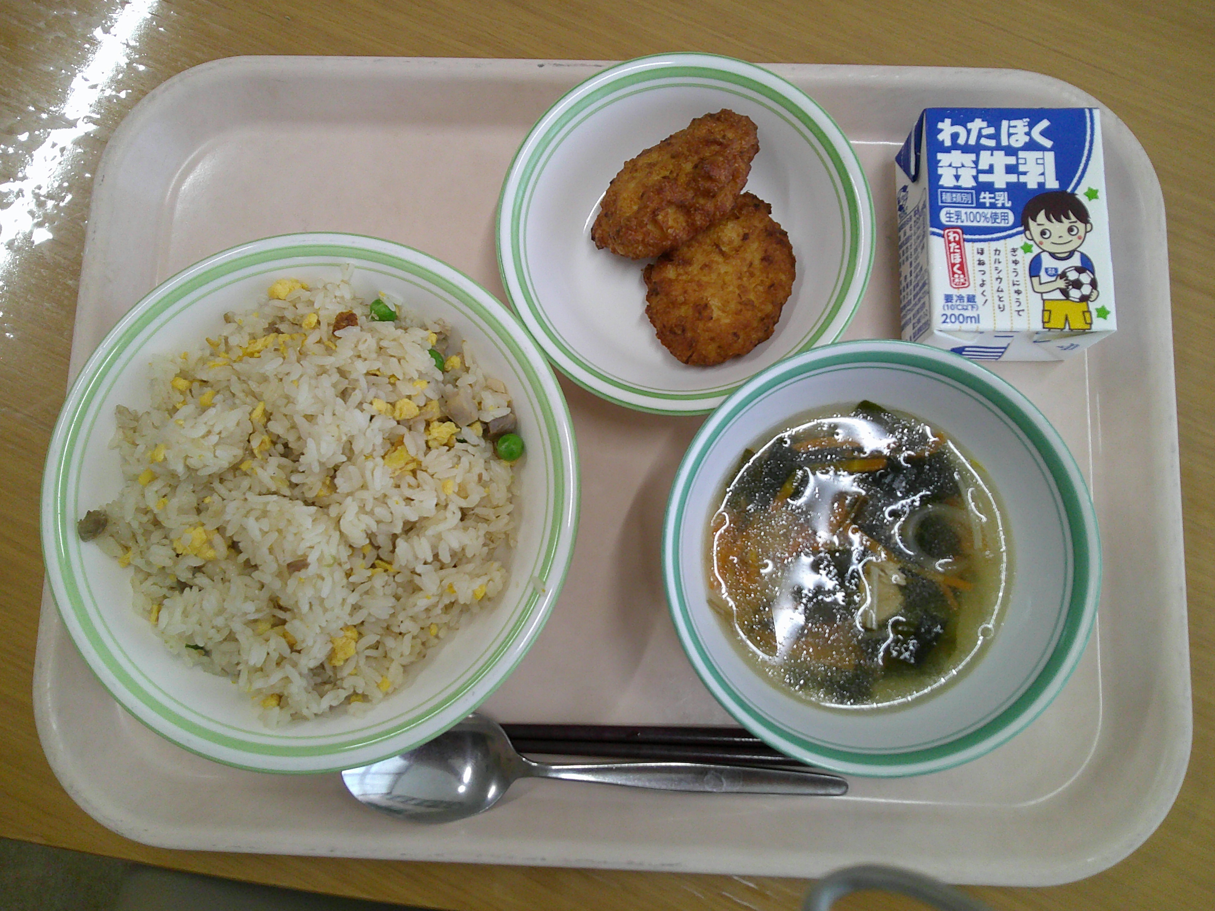 牛乳、チャーハン、豆腐ナゲット、わかめスープ