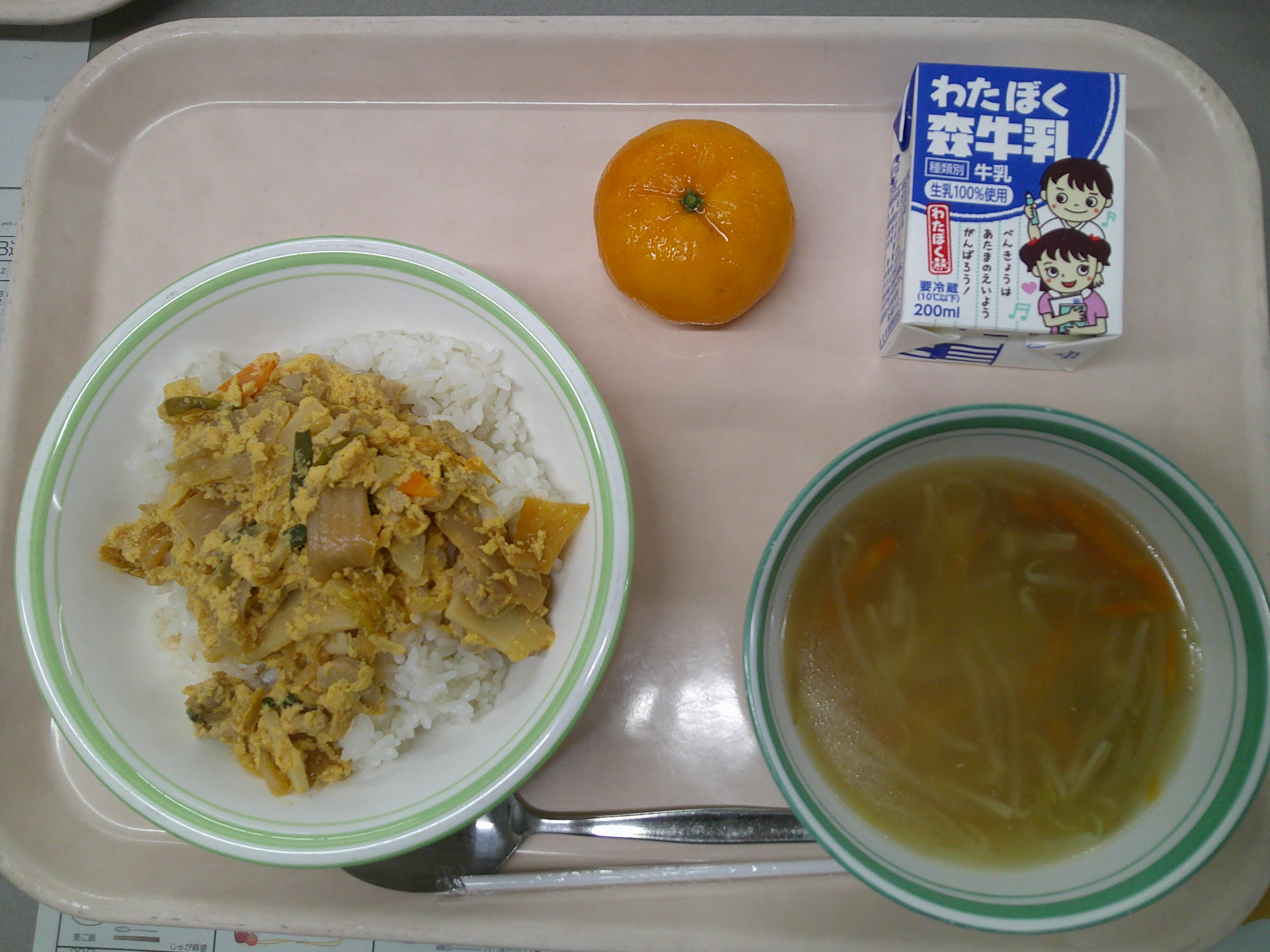 牛乳、卵丼、れんこんとナッツとだいずのカレー風味、磯香和え