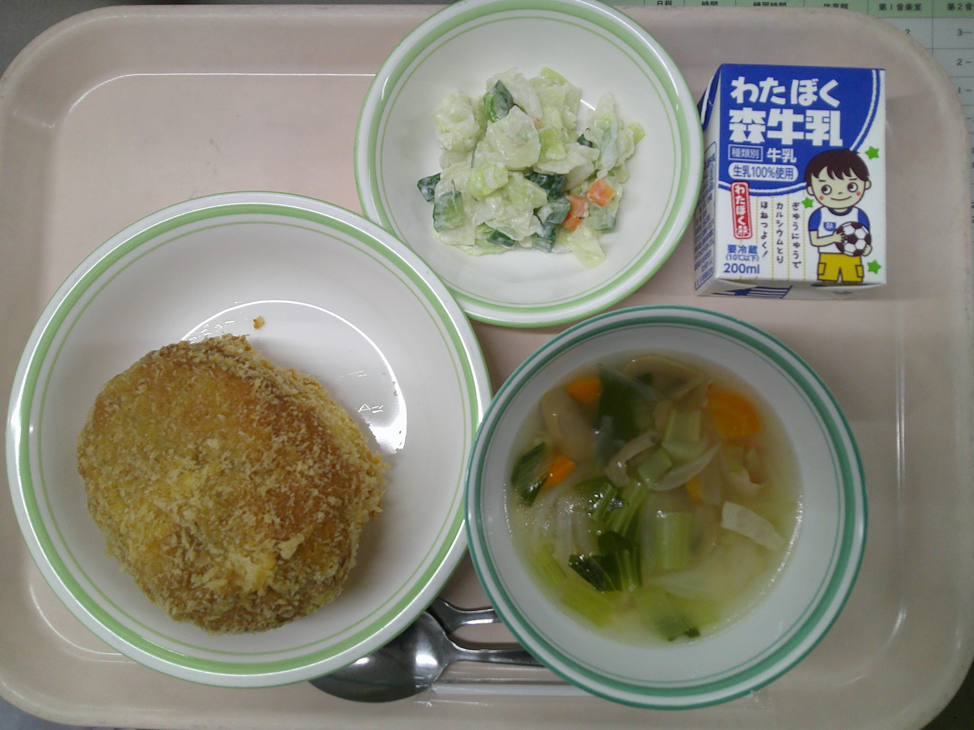 牛乳、手作りカレーパン、シーザーサラダ、ABCスープ