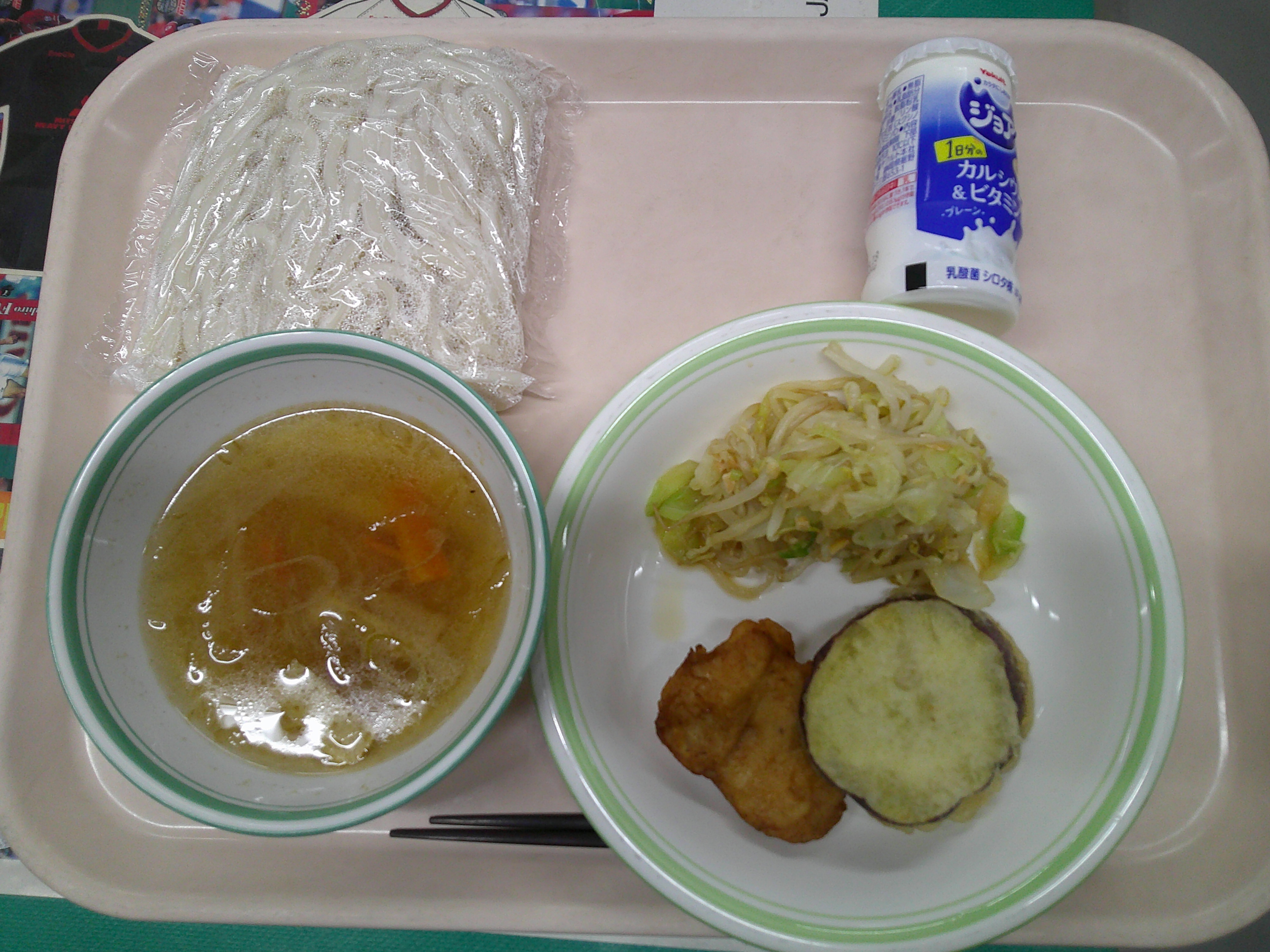 牛乳、冷製肉みそうどん、野菜コロッケ、ヨーグルト