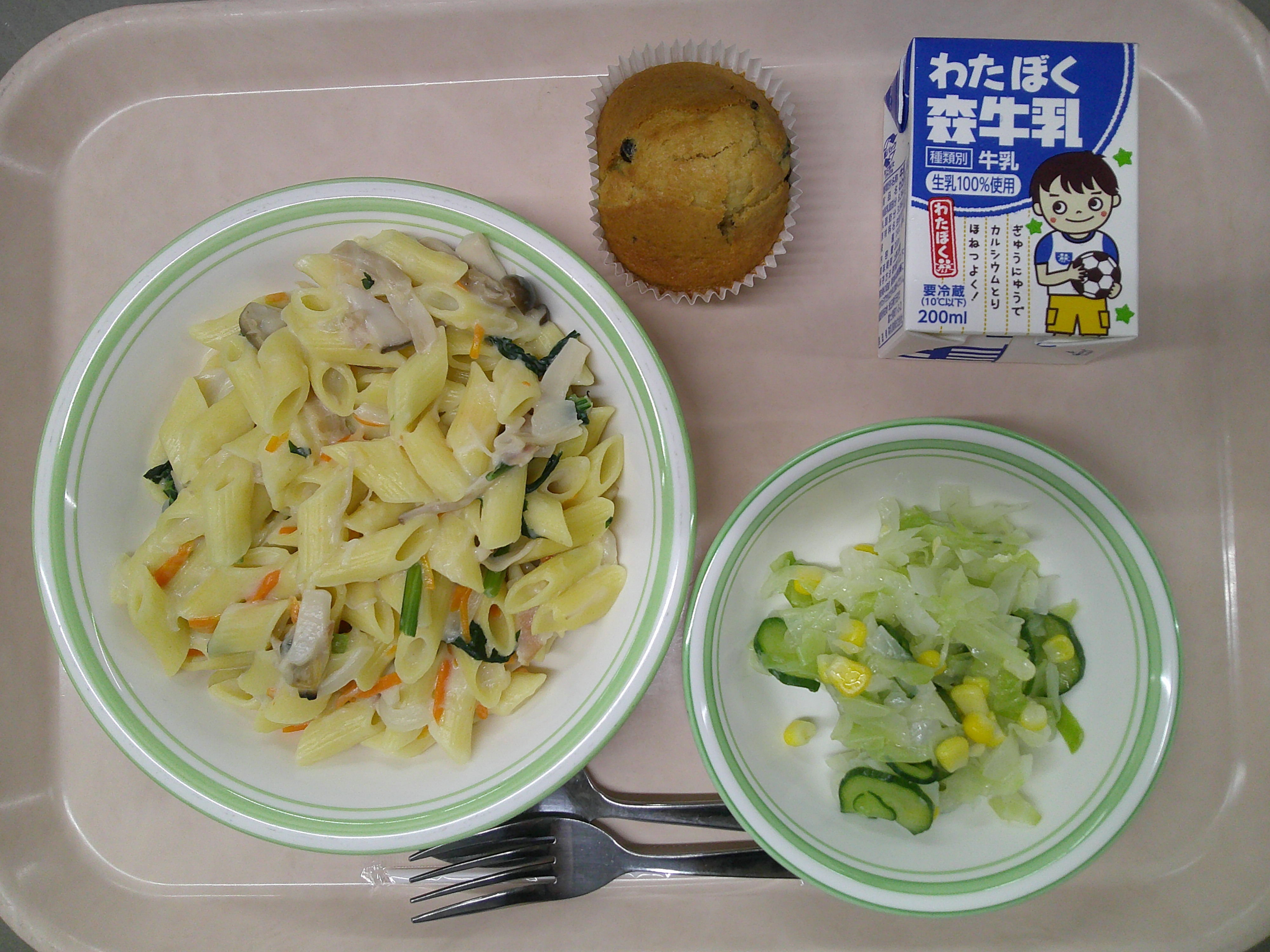牛乳、きのこのクリームペンネ、コーンサラダ、ブルーベリーマフィン