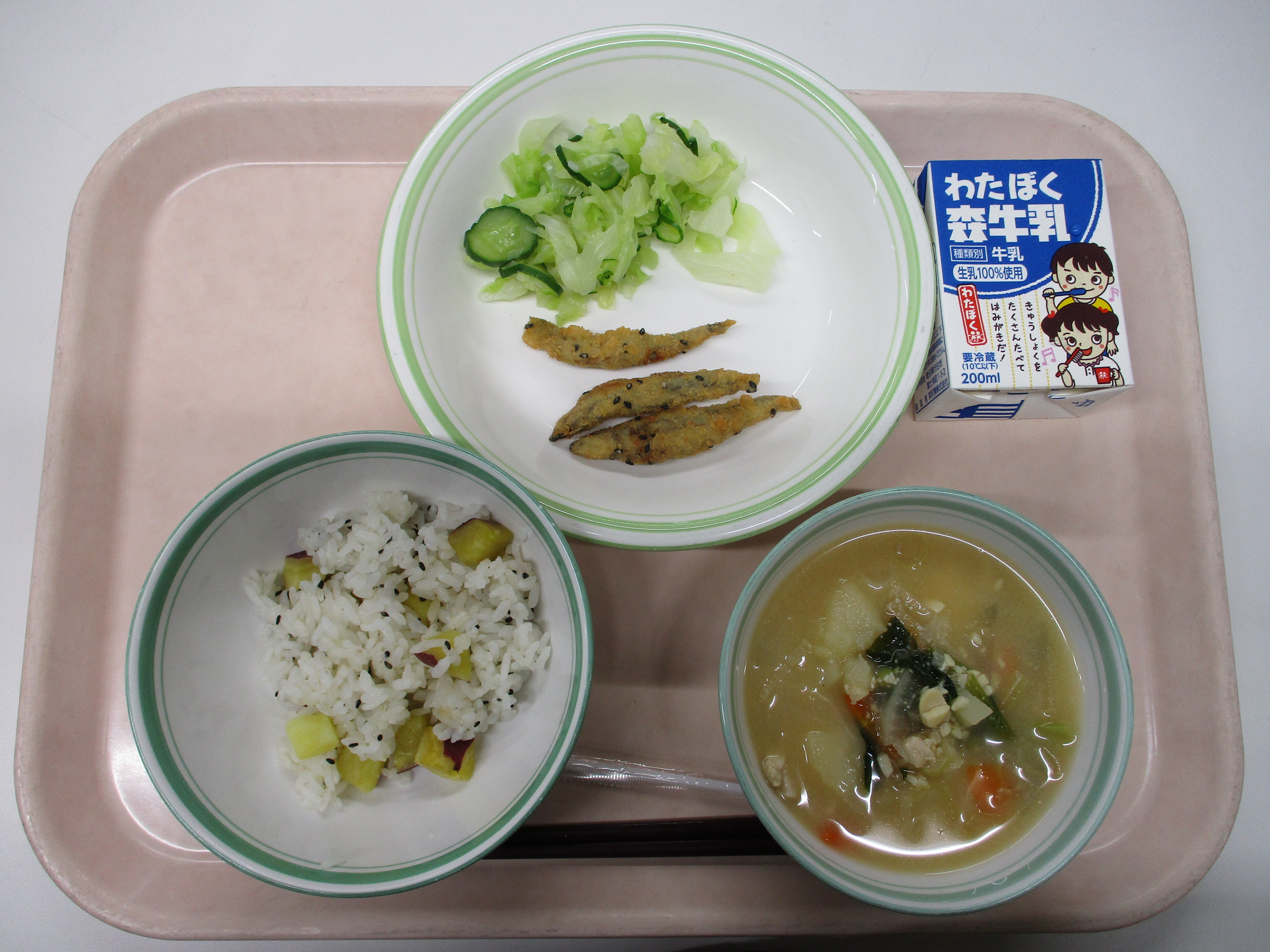 牛乳、さつまいもご飯、きびなごごまフライ、即席漬け、呉汁