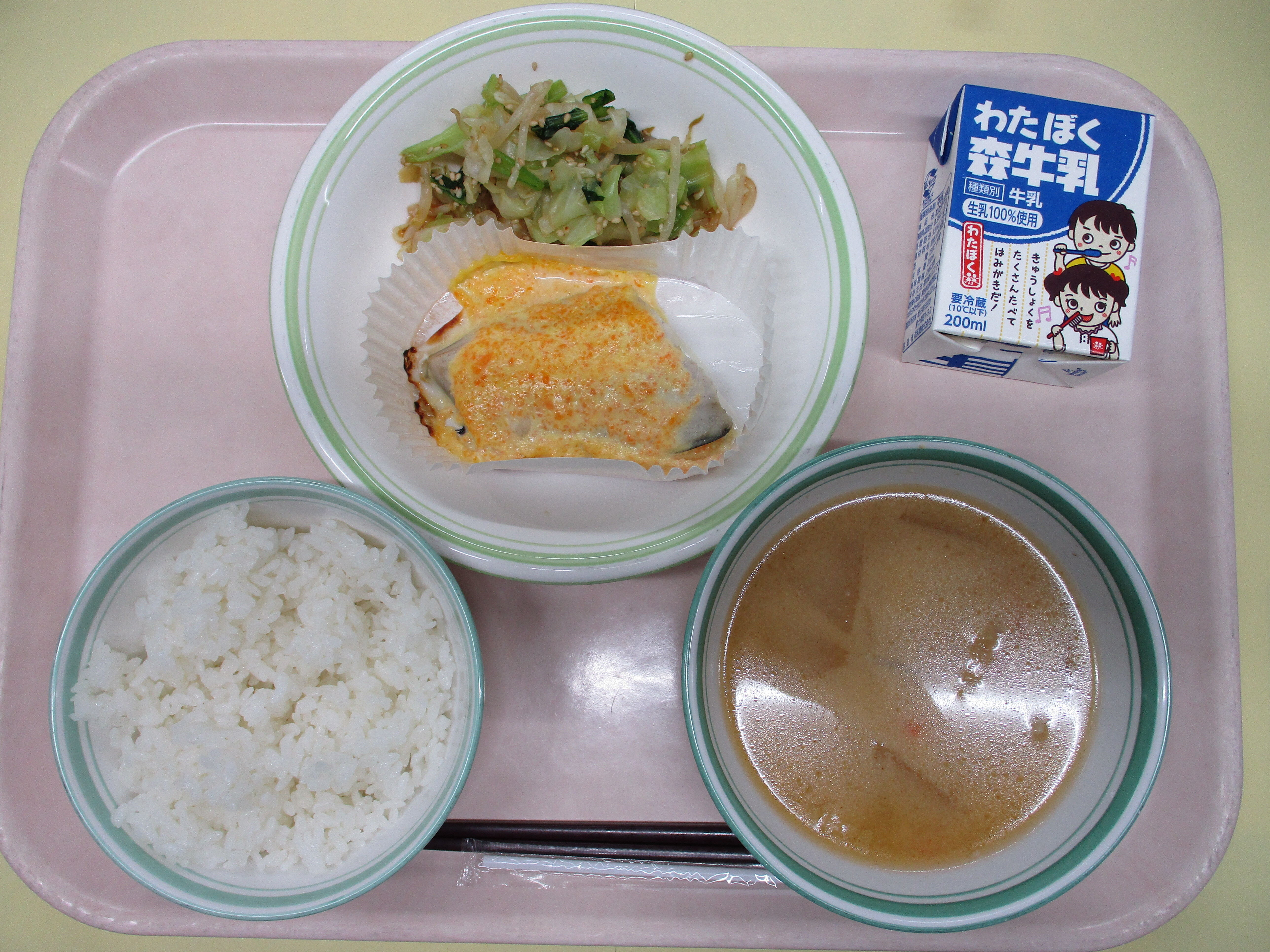 牛乳、岩槻ご飯、さわらの紅葉焼き、ごまあえ、豚汁