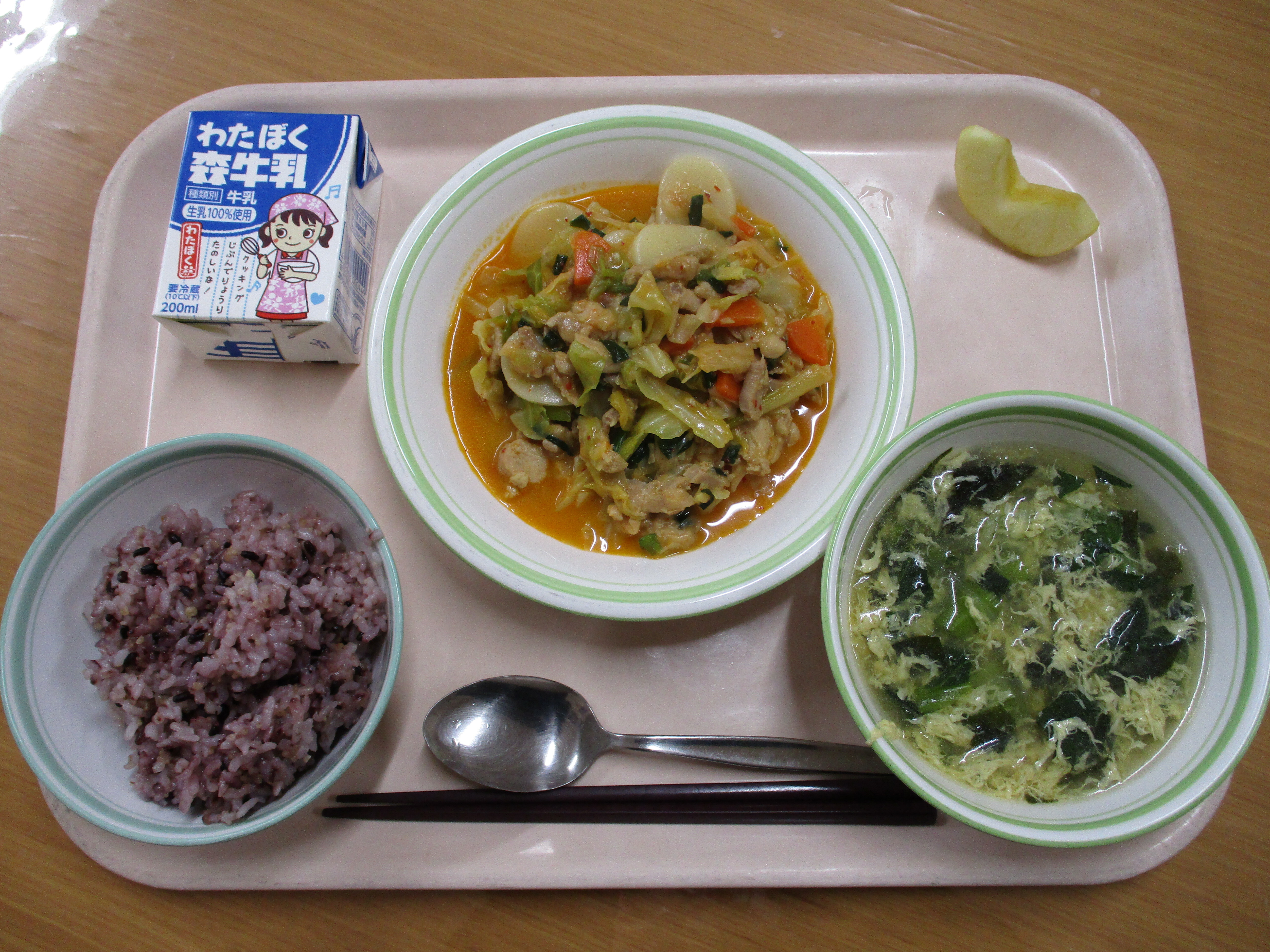 牛乳、鶏肉のチーズタッカルビ、わかめスープ、りんご