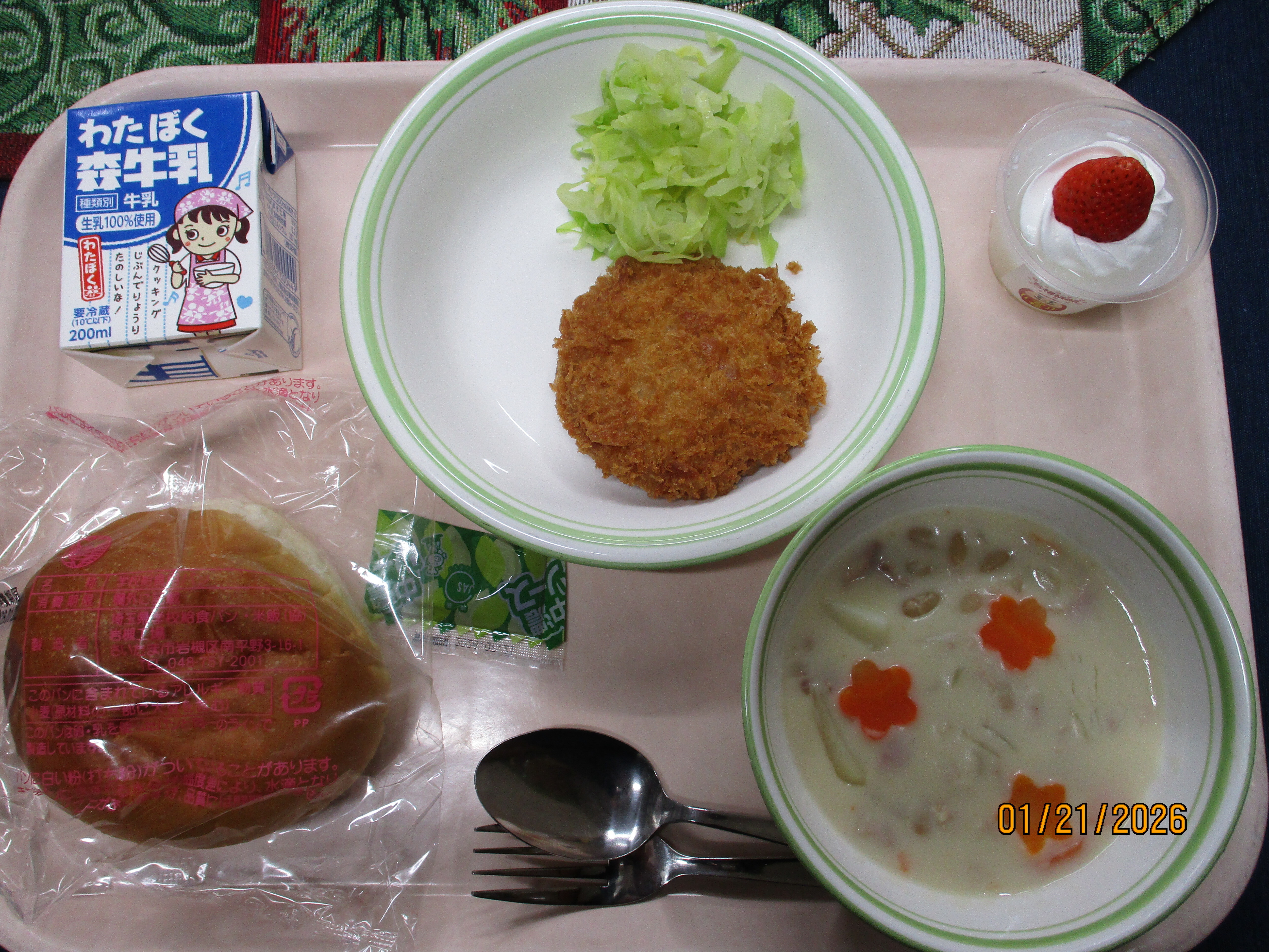 牛乳、岩槻ねぎ塩焼きそば、岩槻コロッケ、かぼちゃスープ