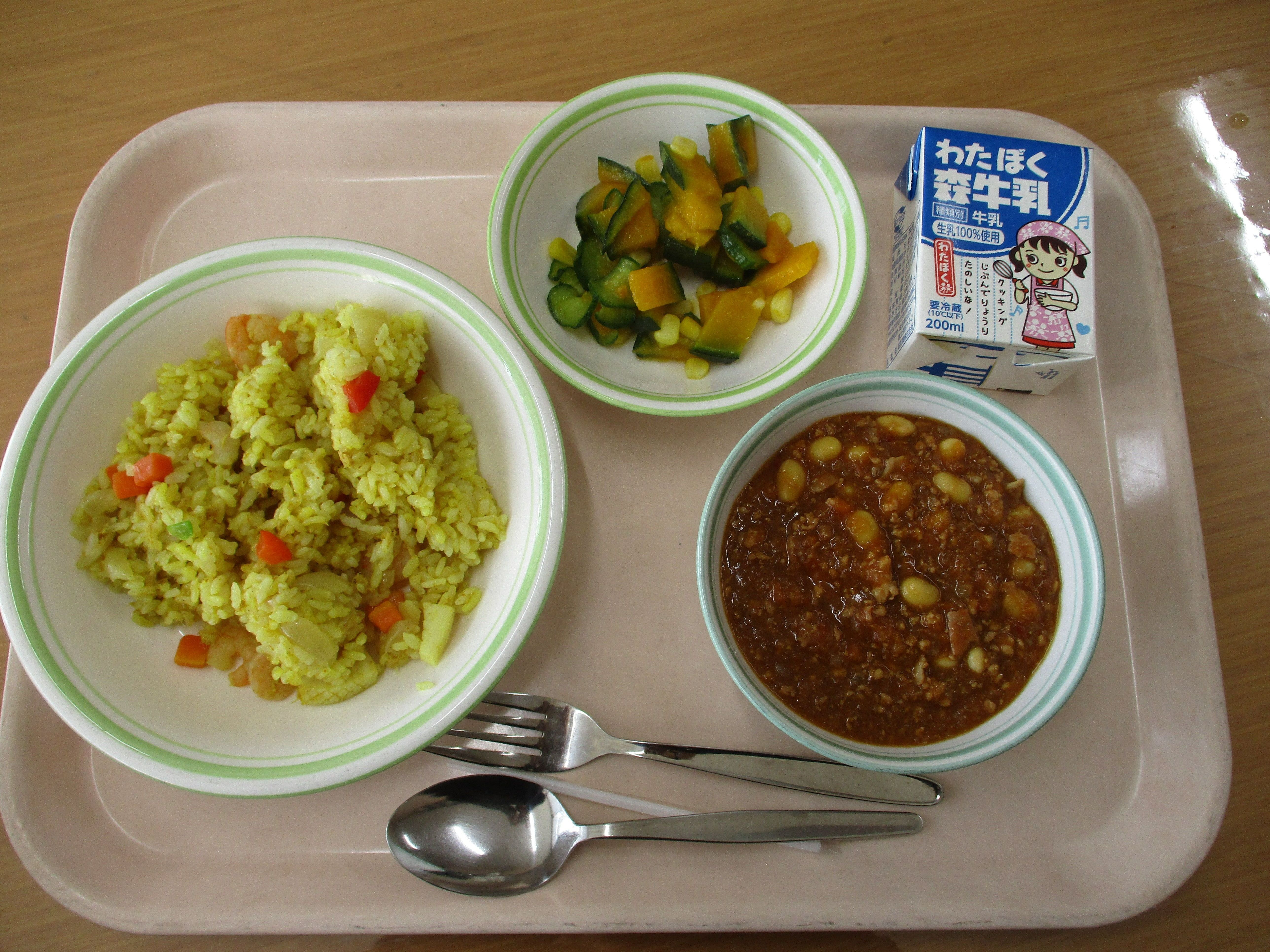 牛乳、メキシカンライス、チリコンカン、かぼちゃサラダ