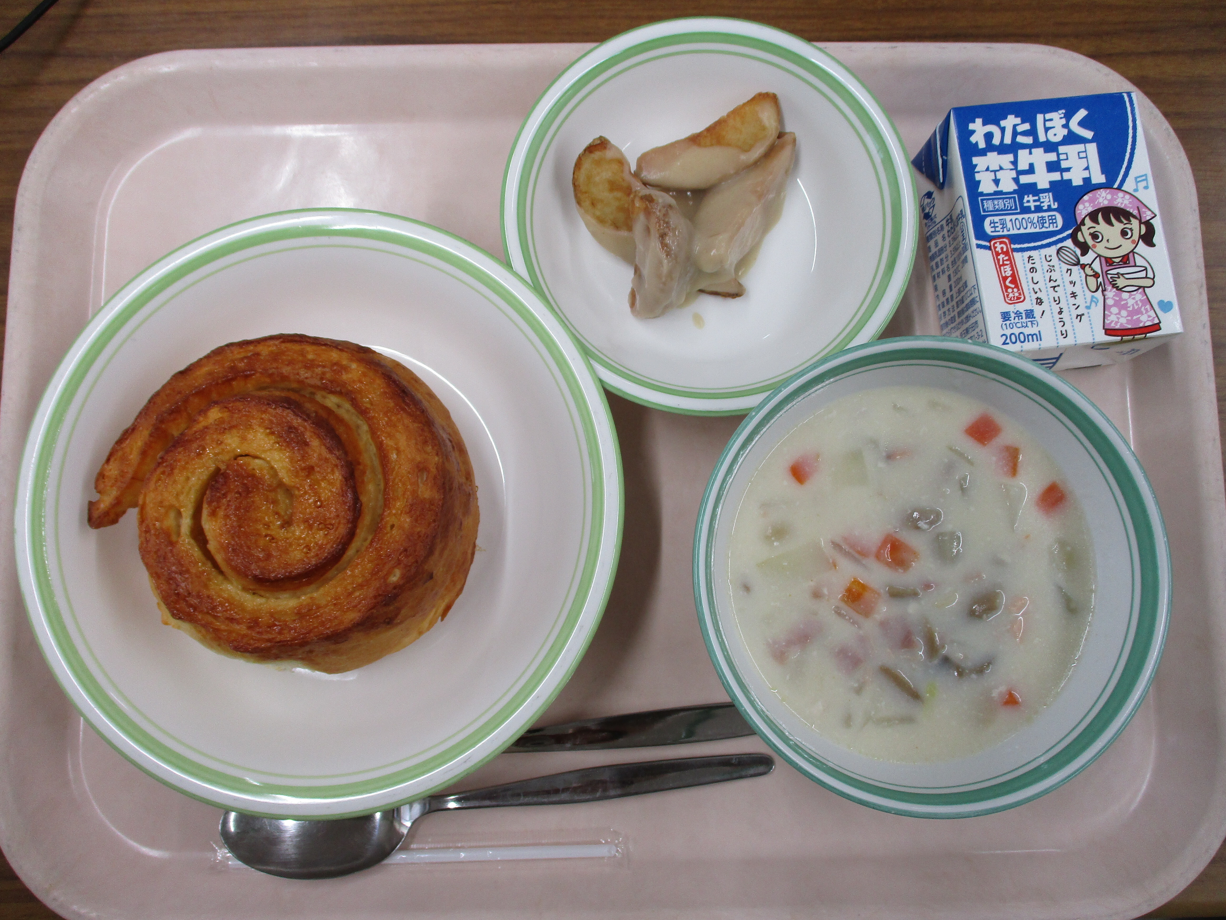 牛乳、2色揚げパン(ココナッツ・シナモン)、じゃがいものスープ煮