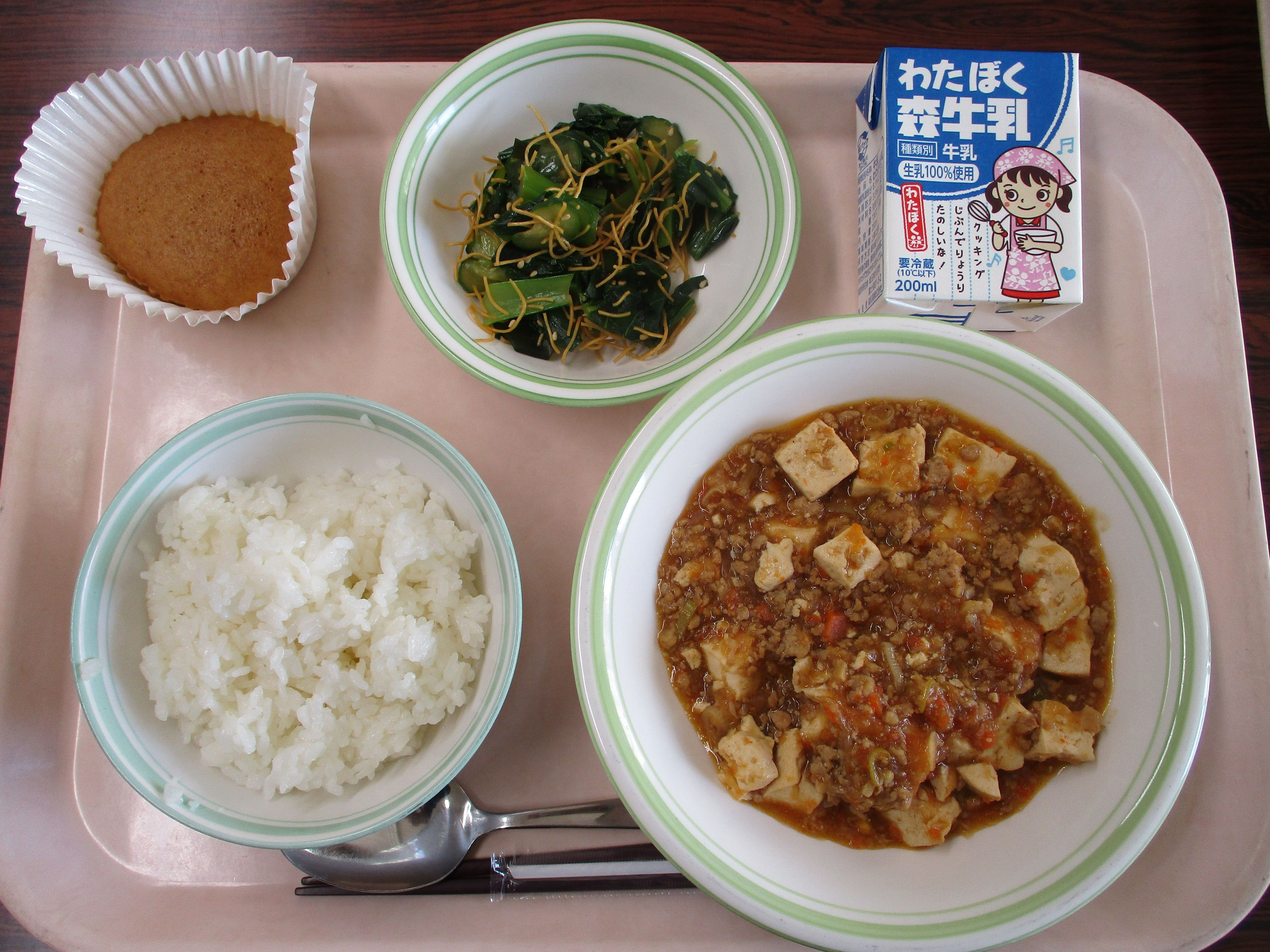 牛乳、岩槻ご飯、四川麻婆豆腐、パリパリサラダ、マーラーカオ